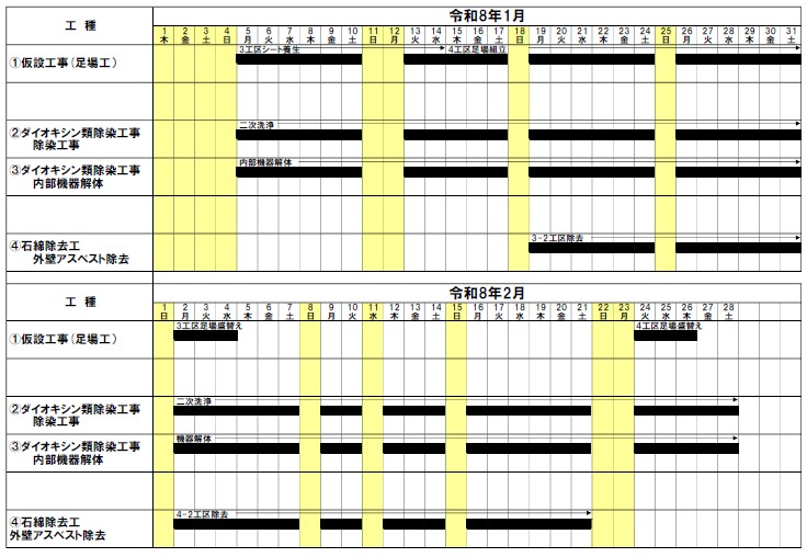 2026年1月および2月の月間工程表です。 ≪工程表の各作業内容≫ ①:アスベスト除去に伴う足場の設置およびシート養生を行います。 ②:プラント内の汚染物質を高圧洗浄機で除去し、汚染水は処理プラントで回収します。 ③:建屋内部の機器(焼却のためのプラント)の解体を行います。 ④建屋の石綿が含有する外壁塗材を、集じん機が付いたグラインダーを使用して除去を行います。